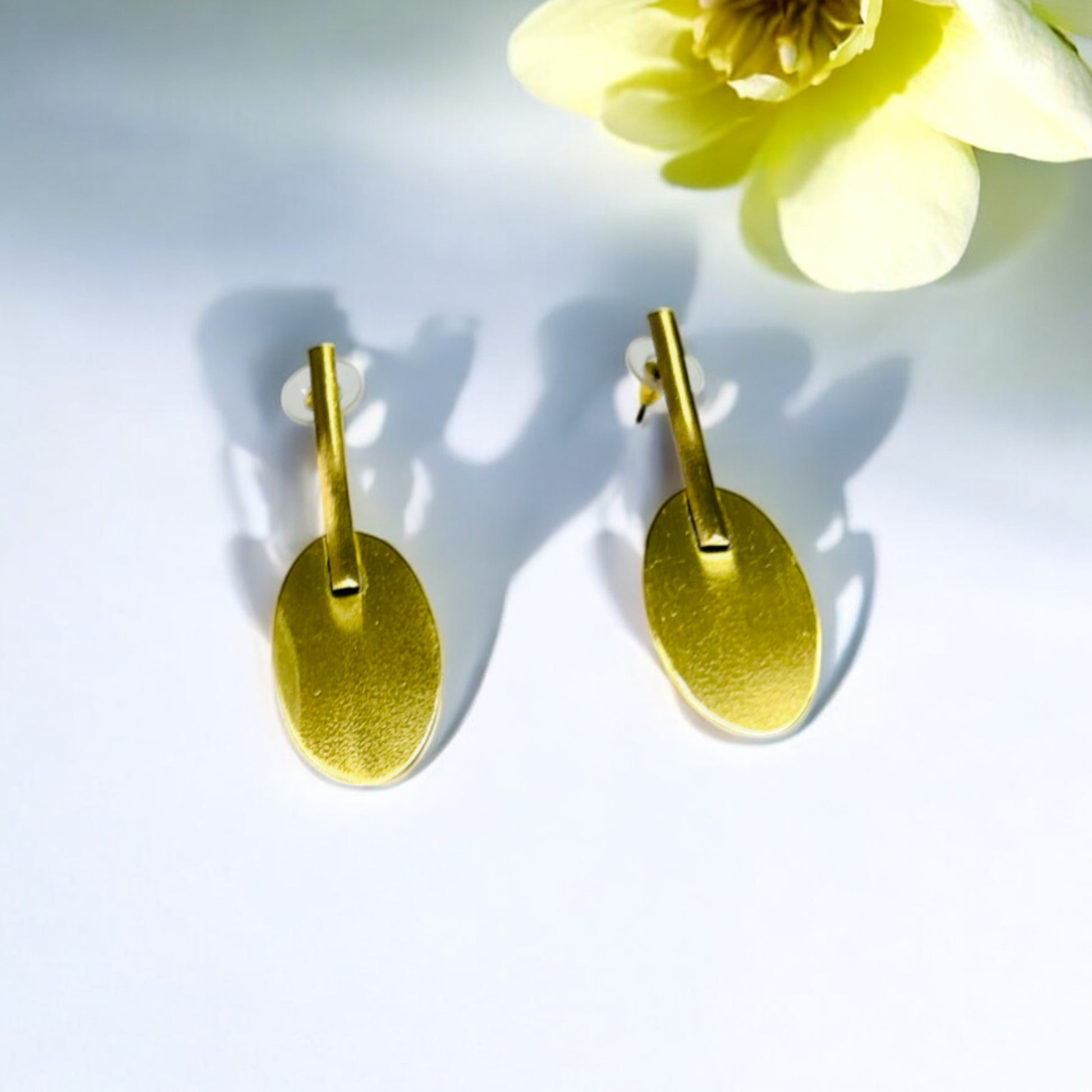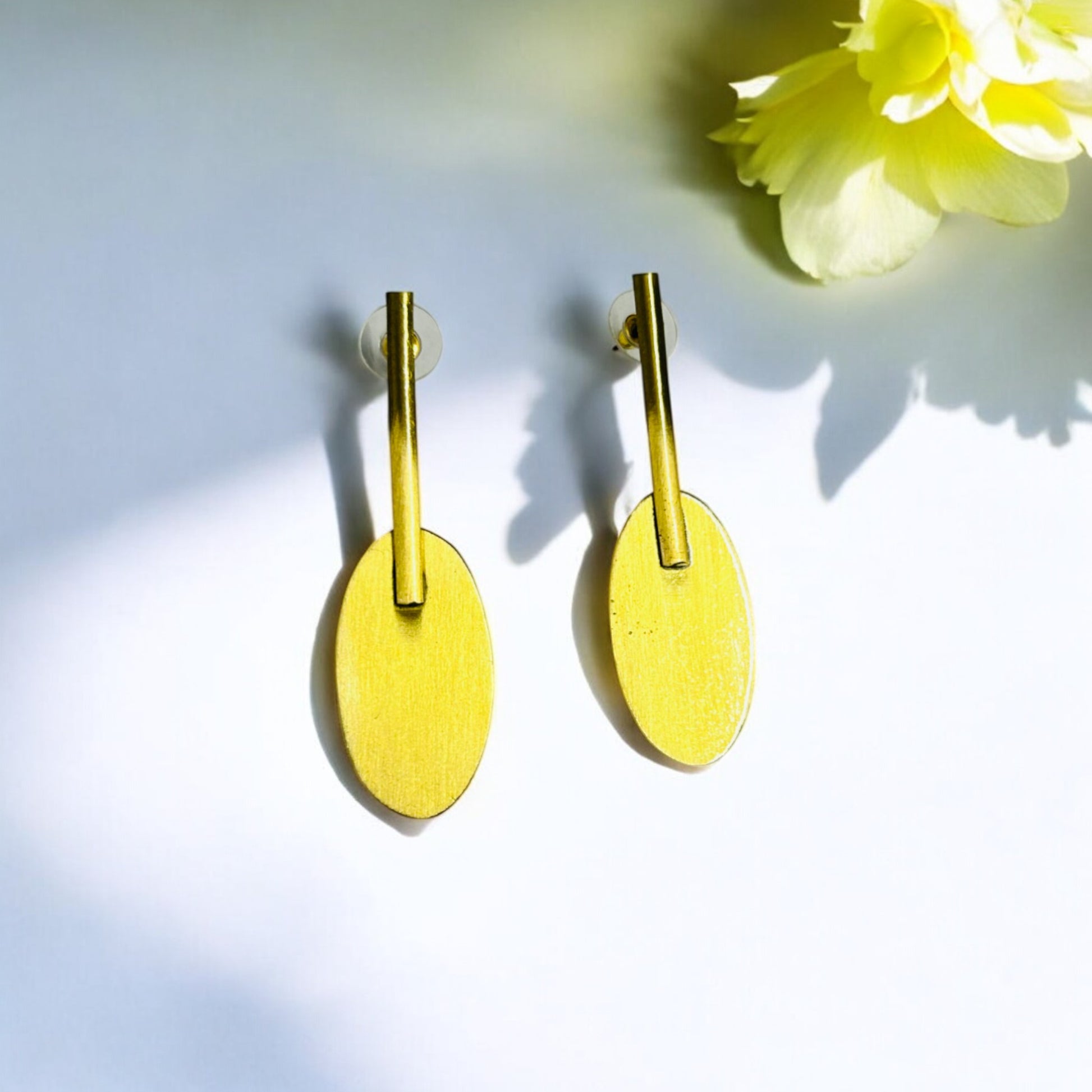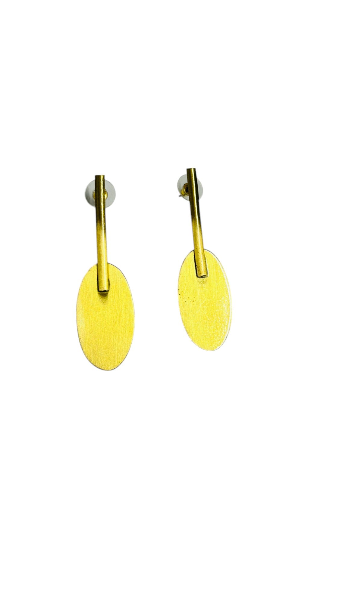Add a modern twist to your jewellery collection with our Geometric Brass Earrings from White & Pastels. Featuring a unique geometric oval shape paired with a minimalist bar design, these earrings bring an edgy yet sophisticated flair to any outfit. The anti-tarnish brass finish ensures they maintain their shine and elegance for years to come.
