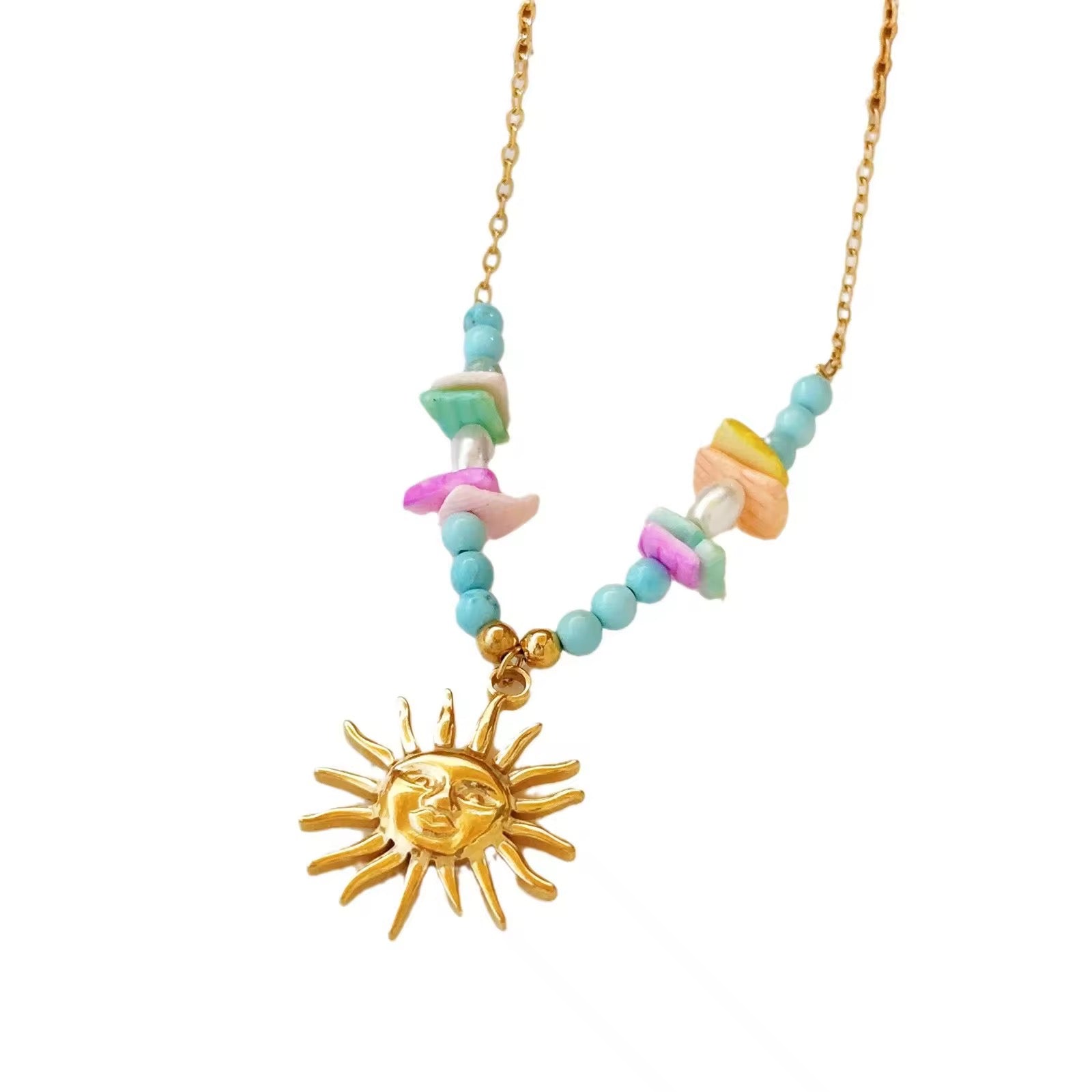 Crafted from high-quality stainless steel and featuring advanced anti-tarnish technology, this necklace ensures a lasting, radiant shine, making it perfect for all your sunny adventures. The delicate chain is adorned with a striking golden sun pendant, symbolizing warmth and positivity, and colorful bead accents in pastel hues, creating a captivating summery look.