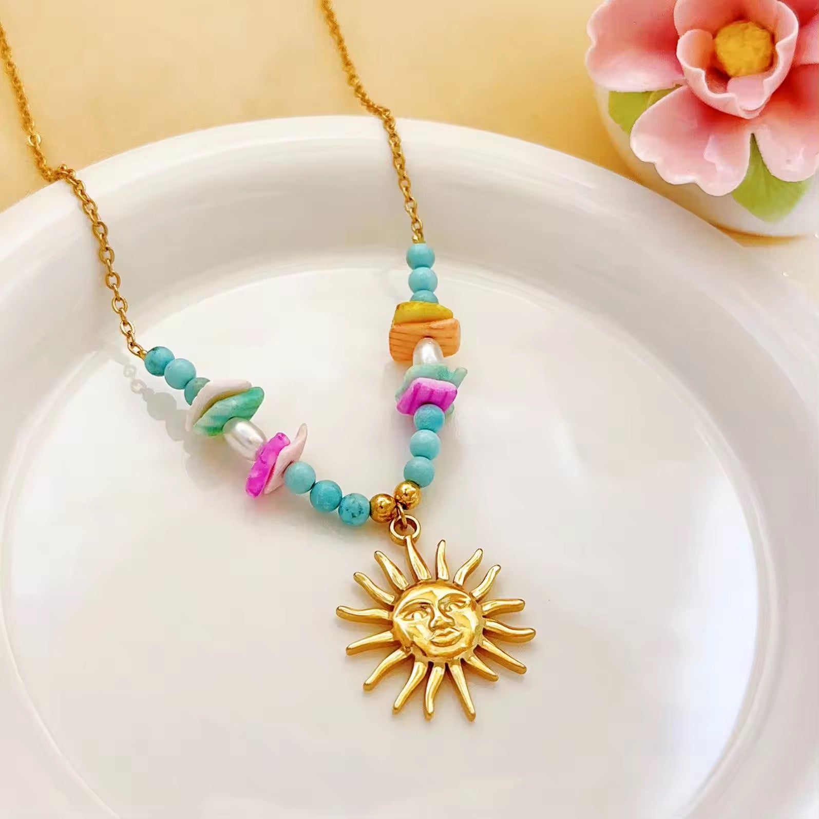 Whether you're heading to a beach party, a summer festival, a casual brunch, or adding a pop of color to your summer outfits, this necklace is versatile enough to complement any look. Its lightweight design ensures comfort, even in the heat, while the unique combination of the sun pendant and vibrant beads adds a touch of bohemian flair.