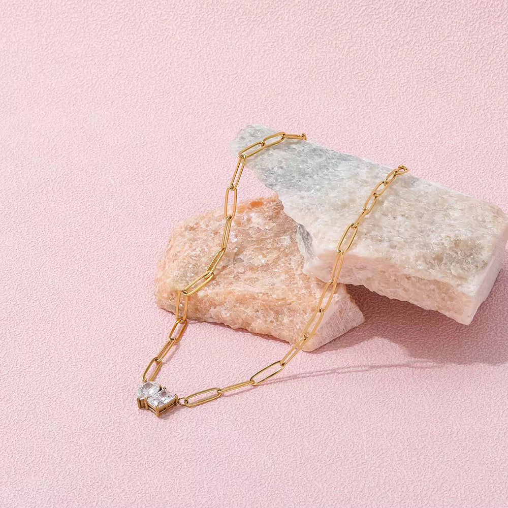 Crafted from high-quality stainless steel and featuring advanced anti-tarnish technology, this necklace ensures a lasting, brilliant shine, making it perfect for everyday wear and special occasions. The unique paperclip chain design adds a modern, edgy touch, while the dual gem pendants – a heart-shaped cubic zirconia and a rectangular cubic zirconia – bring a touch of glamour and sophistication.