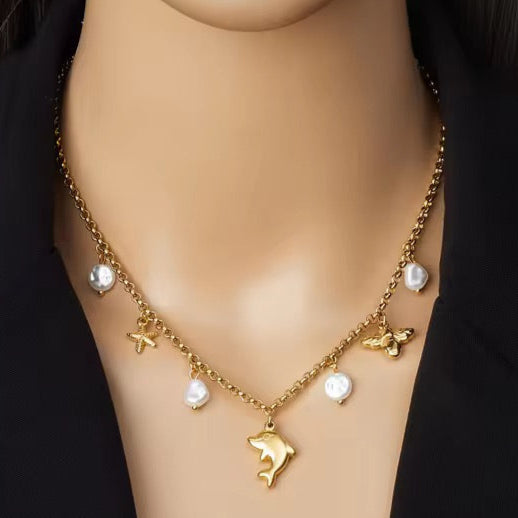 Oceanic Bloom: Anti-Tarnish Stainless Steel Dolphin, Starfish & Pearl Necklace - Summer Charm